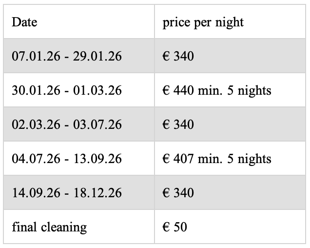 The prices include the statutory VAT and an occupancy of up to 6 people. In addition, the valid local tax of 3.00 euros per person and day must be paid. Children up to the age of 14 are exempt from the local tax.